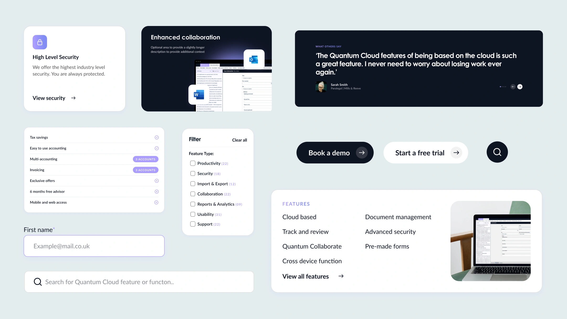 Quantum Cloud approached us with a clear objective: to redesign their website in a way that would drive more sign-ups and effectively communicate the unique benefits of their software. Their existing site was functional but lacked the dynamic user experience needed to convert visitors into loyal users. With a diverse audience, ranging from solo practitioners to large law firms, Quantum Cloud required a site that spoke directly to each user persona, highlighting how the software could meet their specific needs.